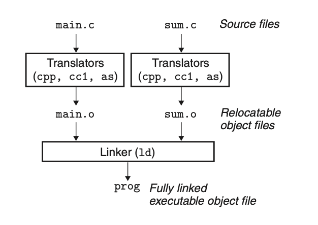 Finally, it runs the linker program ld, which combines main.o and sum.o, along with the necessary system object files, to create the binary executable object file prog: